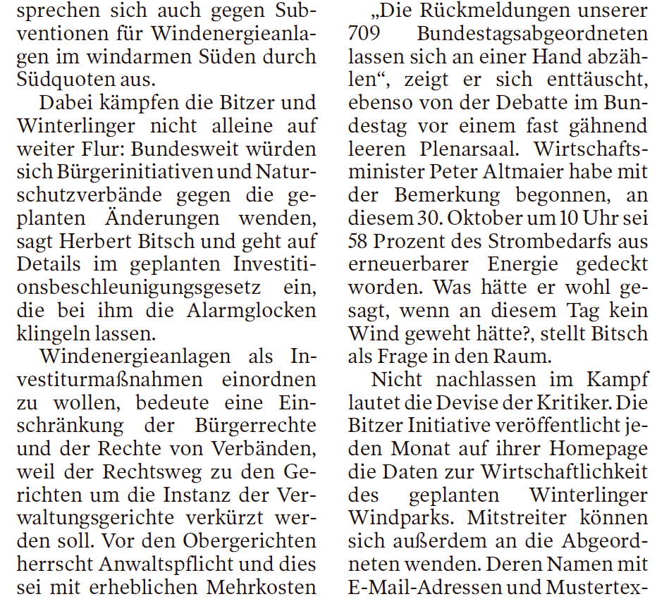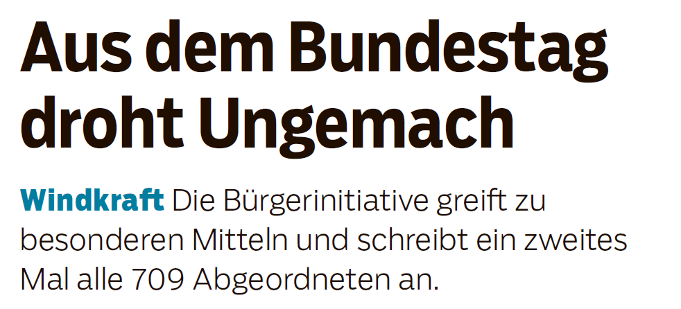 Im Rundbrief „Protest ist angesagt“ fordert die NI alle Bürger auf, bei den Bundestagsabgeordneten gegen den Entwurf des Investitionsbeschleunigungsgesetzes zu protestieren. Herbert Bitsch, Sprecher der Windkraftgegner: „Wir schließen uns auch dieser Aktion an. Im Juli baten die Windkraftgegner, den Bundestagsabgeordneten Thomas Bareiß zu kontaktieren. Nun rufen die Bürgerinitiativen Bitzer BBI-WK und Winterlinger IGFR die Bürger dazu auf, sich auch in dieser Sache zu engagieren.