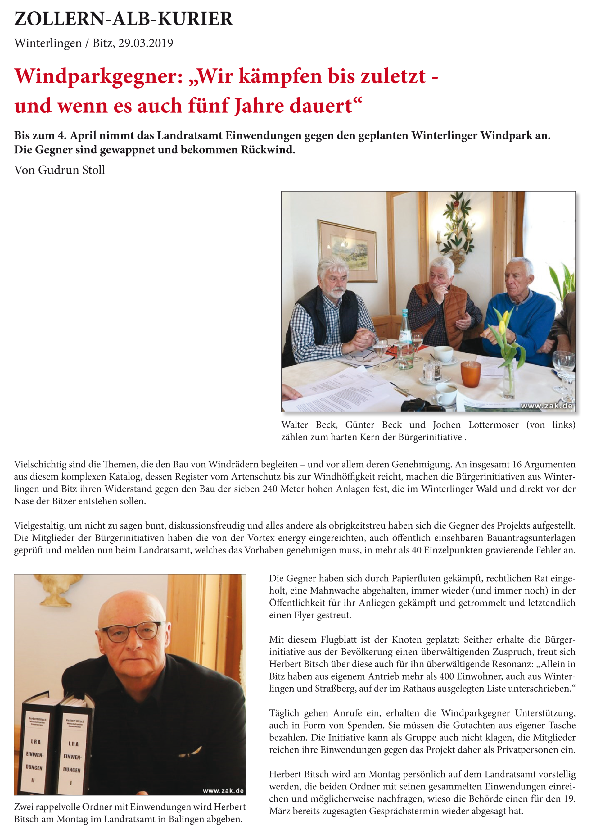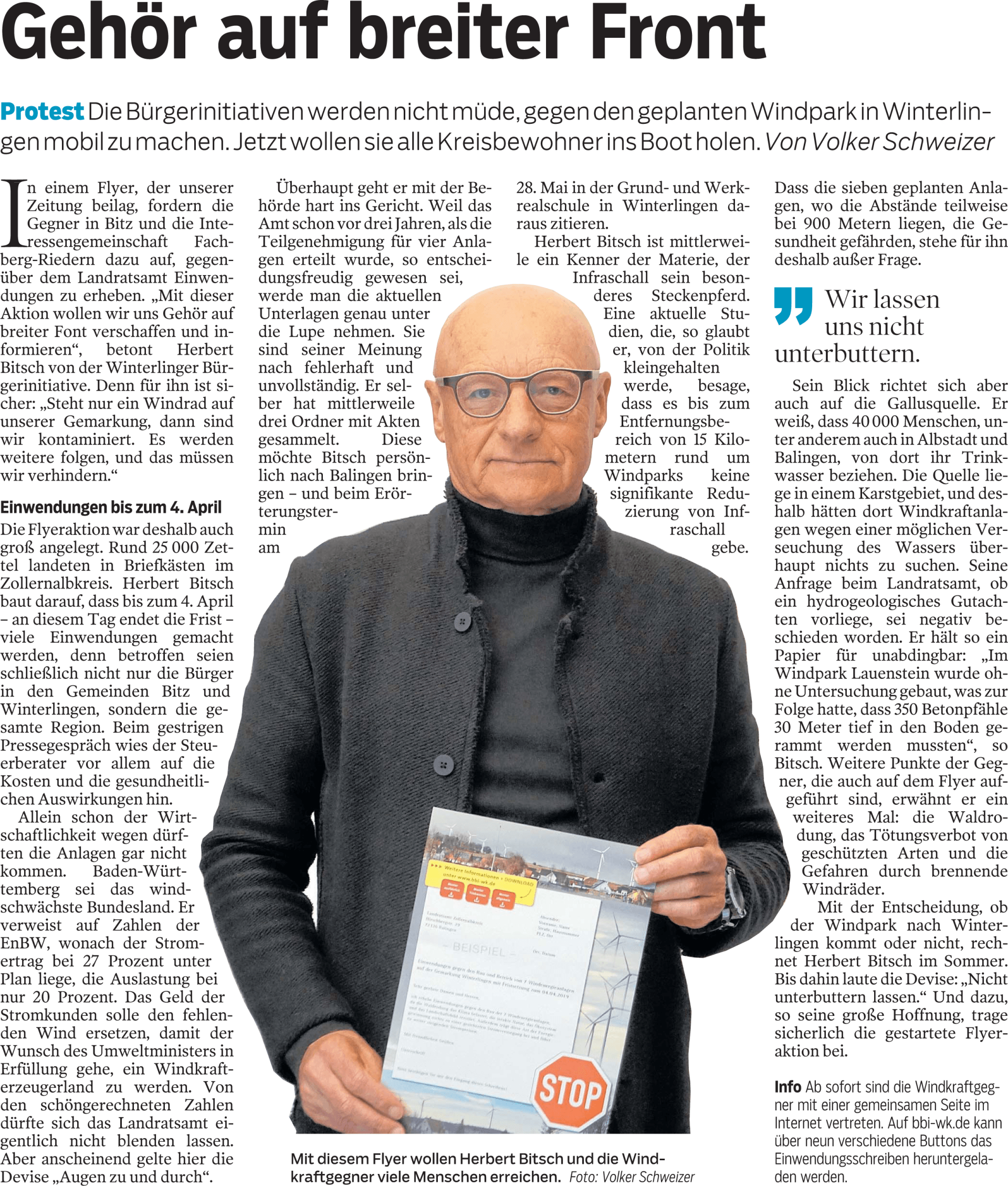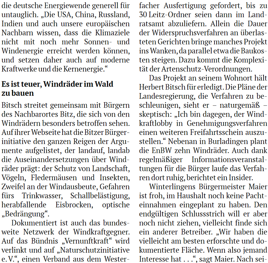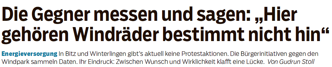 Seit knapp fünf Jahren wenden sich Bitzer und Winterlinger Bürger mit den Initiativen Bitzer BBI-WK (Bürgerinitiative gegen Windkraft) und Winterlinger IGFR (Interessengemeinschaft Fachberg-Riedern) gegen den Bau einer Windkraftanlage im Wald zwischen Bitz und Winterlingen. Mehrere Argumente werden gegen den Bau der sieben, knapp 239 Meter hohen Windräder angeführt: Gesundheitsgefährdung durch Infraschall, Eisabwurf und Schattenschlag, Gefährdung des Grund- und Trinkwassers, Rodung, Landschaftsverbrauch, Klimabelastung und gegen Ausnahmen vom Tötungsverbot des Bundesnaturschutzgesetzes. Weitere Informationen gibt’s auf: naturschutz-initiative.de und bbi-wk.de