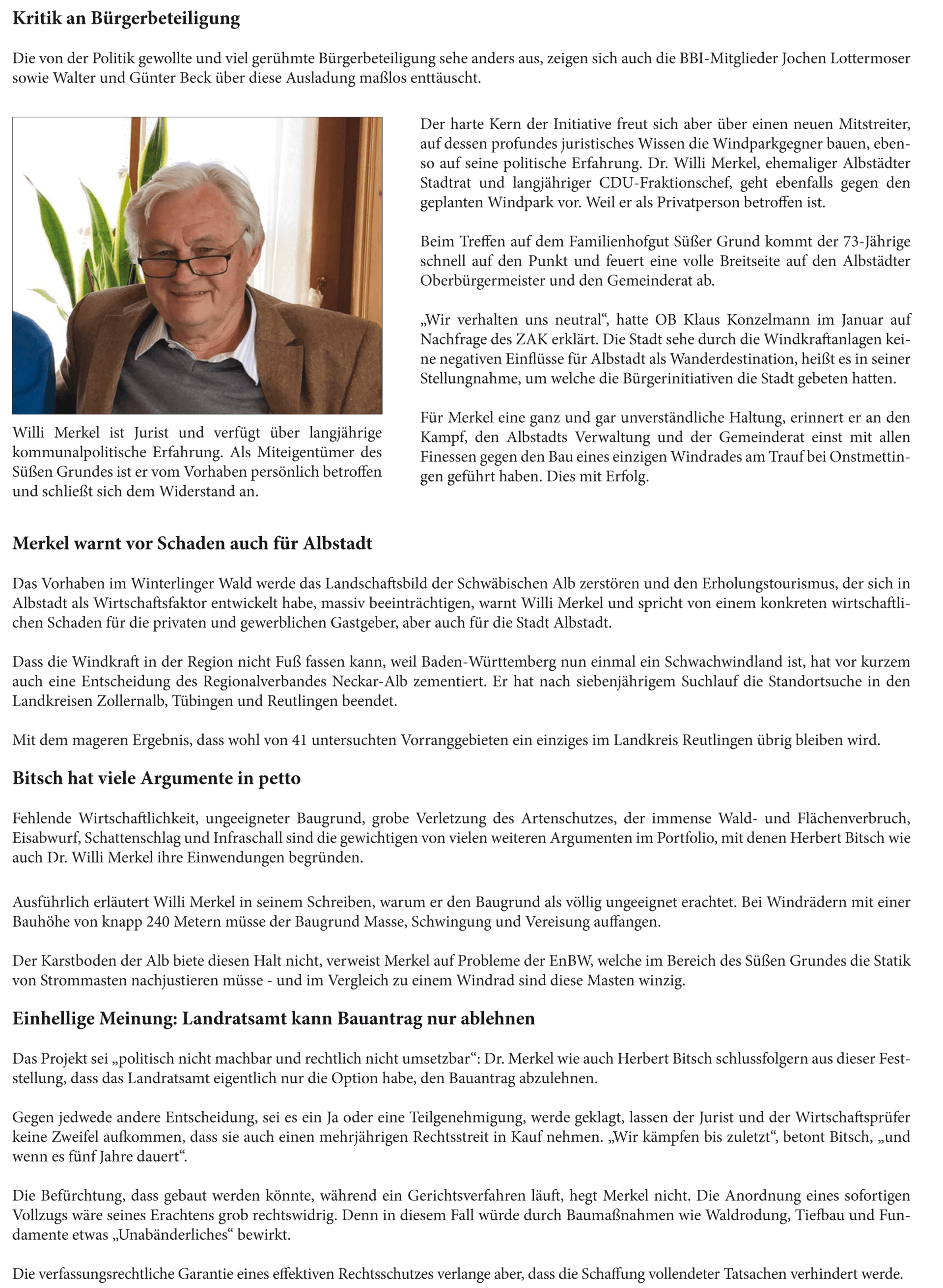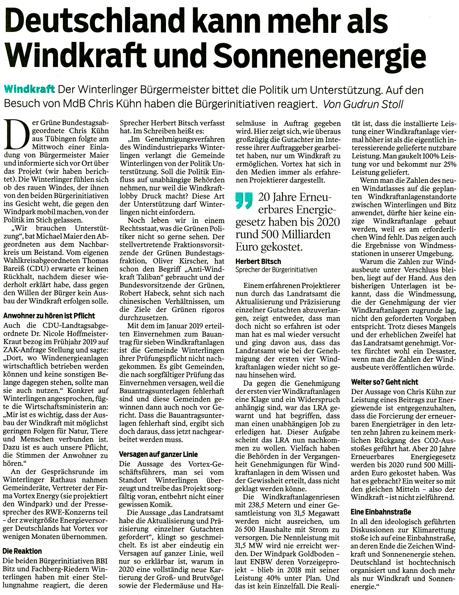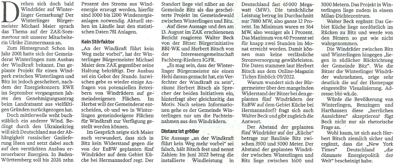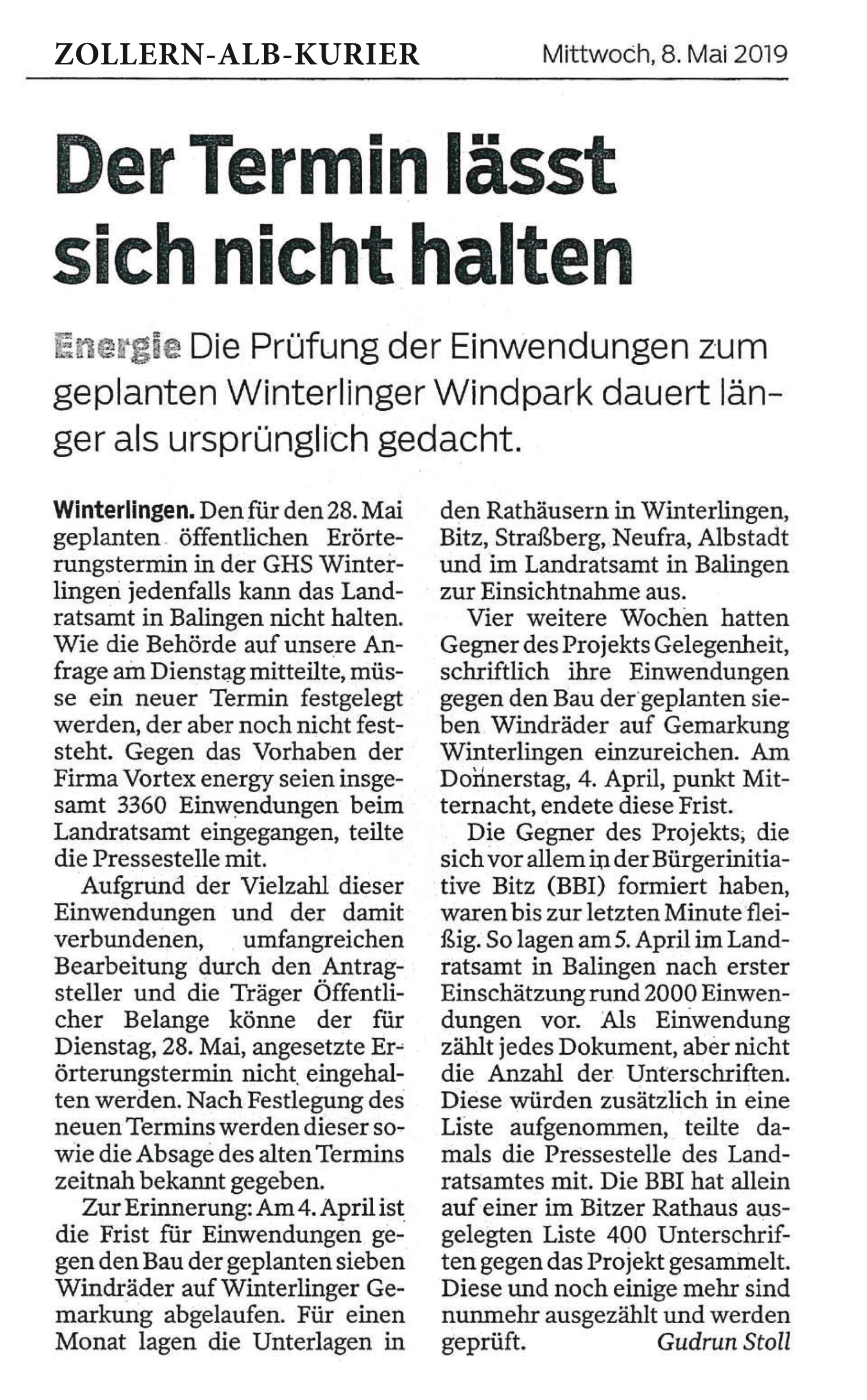 Seit knapp fünf Jahren wenden sich Bitzer und Winterlinger Bürger mit den Initiativen Bitzer BBI-WK (Bürgerinitiative gegen Windkraft) und Winterlinger IGFR (Interessengemeinschaft Fachberg-Riedern) gegen den Bau einer Windkraftanlage im Wald zwischen Bitz und Winterlingen. Mehrere Argumente werden gegen den Bau der sieben, knapp 239 Meter hohen Windräder angeführt: Gesundheitsgefährdung durch Infraschall, Eisabwurf und Schattenschlag, Gefährdung des Grund- und Trinkwassers, Rodung, Landschaftsverbrauch, Klimabelastung und gegen Ausnahmen vom Tötungsverbot des Bundesnaturschutzgesetzes. Weitere Informationen gibt’s auf: naturschutz-initiative.de und bbi-wk.de