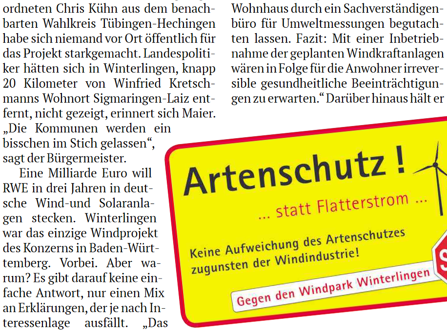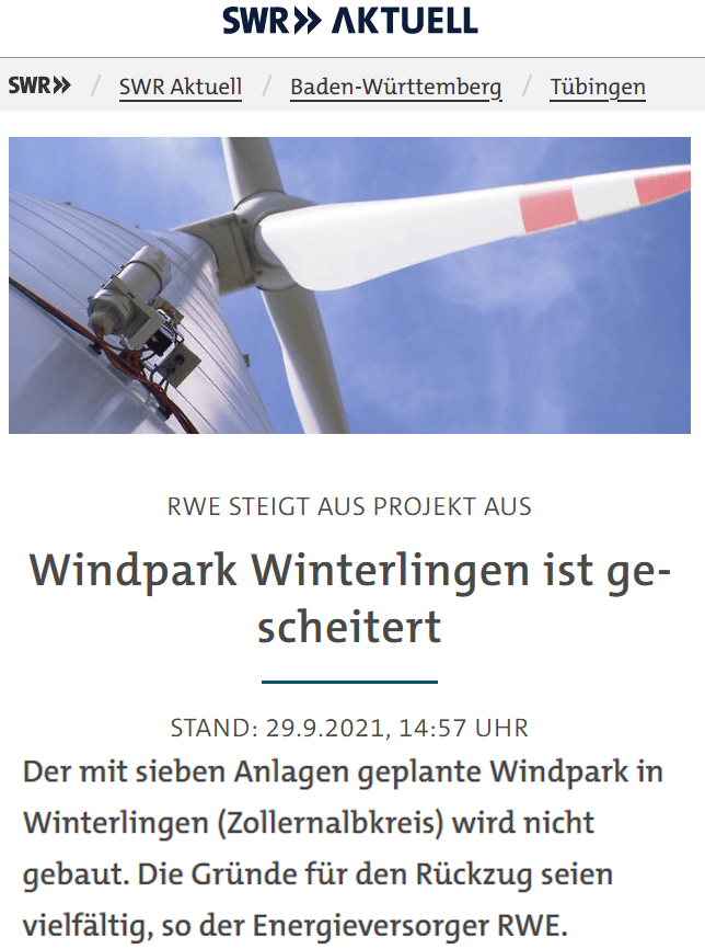 Dennoch hatte RWE später ebenfalls „Umweltinteressen“ als Grund für den Rückzug genannt – neben dem großen Widerstand gegen die geplanten Windräder vor Ort. Dass „Orte wie Winterlingen ein Alptraum für Robert Habeck werden könnten“, bescherte Bitsch später einen Auftritt im Heute-Journal des ZDF.