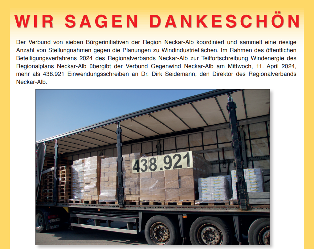 Denn es gibt da noch eine Botschaft, die ein möglichst großer Stapel an Einwendungen am 10. April aussenden soll: „Wir kommen alle aus der Mitte der Gesellschaft“, sagt Thorwart. „Wir sind keine durchgeknallten Leute, wir sind nicht esoterisch.“ Vielmehr, merkt Gegenwind-Hohenzollern-Chef Alexander Edele an, „profitieren wir alle aus Erfahrung aus dem Beruf“. Edele ist Energieberater, kann ein Lied von Anträgen und bürokratischen Wirrungen singen. Weshalb man dann auch „mindestens so viel Fachwissen wie ein Grünenpolitiker“ habe, ist Edele sicher (und kommt damit in der Aufregung doch noch kurzzeitig vom Pfad der ausgerufenen Sachlichkeit ab). Herbert Bitsch, von Beruf Wirtschaftsprüfer und Steuerberater, ergänzt jedenfalls: „Wir mussten uns unser Fachwissen aneignen. Nachdem wir immer wieder angegriffen wurden, müssen unsere Fakten hieb- und stichfest sein.“
