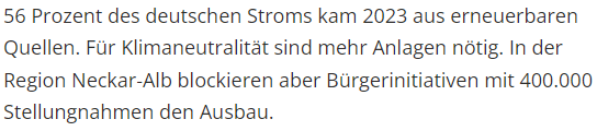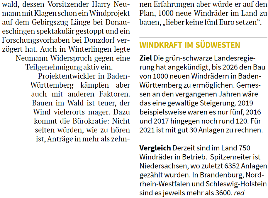 Erwin Feucht (Die Grünen) nannte die Windenergie als alternativlos. Der Energiebericht kompakt 2021 von Baden-Württemberg (Bad.-Württ.) widerlegt diese Aussage. Die Tabelle zum Anteil erneuerbarer Energieträger am Primärenergieverbrauch in Bad.-Württ. seit 1990 zeigt Folgendes: Die Windkraft hatte in 2019 bei knapp 800 installierten WEA nur einen Anteil von 0,7_Prozent am Primärenergieverbrauch. Um zum Beispiel rechnerisch 14 Prozent zu erreichen, müsste man das 20-fache an WEA, also rund 16.000 WEA allein in Bad.-Württ. bauen. Wenn man bedenkt, dass es Deutschlandweit rund 28.000 WEA gibt, sind 16.000 WEA allein für Bad.-Württ. nicht vorstellbar.