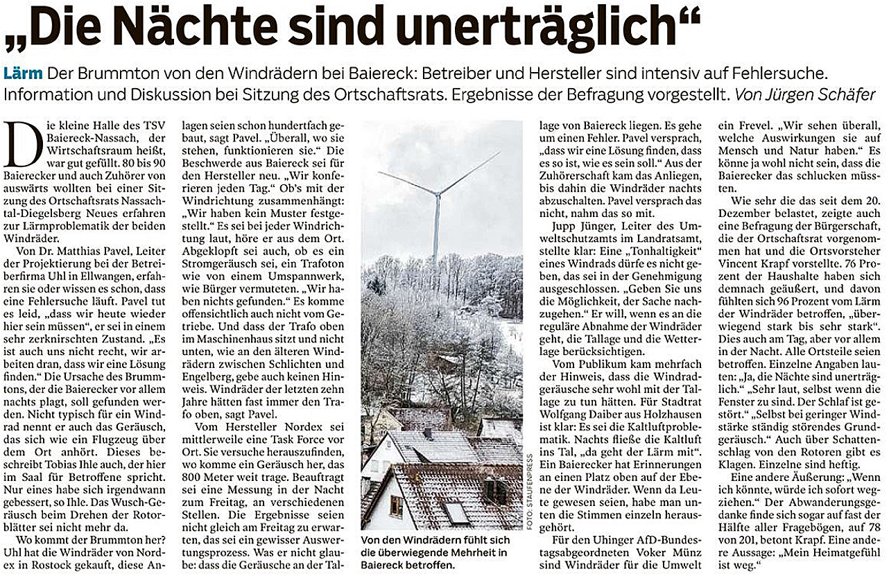 Am 20.12.2024 wurden am Windkraftstandort ES-02 Sümpflesberg / Königseiche in Ebersbach – Büchenbronn (Baden-Württemberg, Landkreis Göppingen) zwei Windkraftanlagen des Typs Nordex N 149 in Betrieb genommen. Seither kommt es in Uhingen-Baiereck im Nassachtal zu massiven Beschwerden über Lärmbelästigungen. Der Ortschaftsrat von Nassachtal / Diegelsberg hat deshalb eine Bürgerbefragung zu den Auswirkungen der Windkraftanlagen durchgeführt.