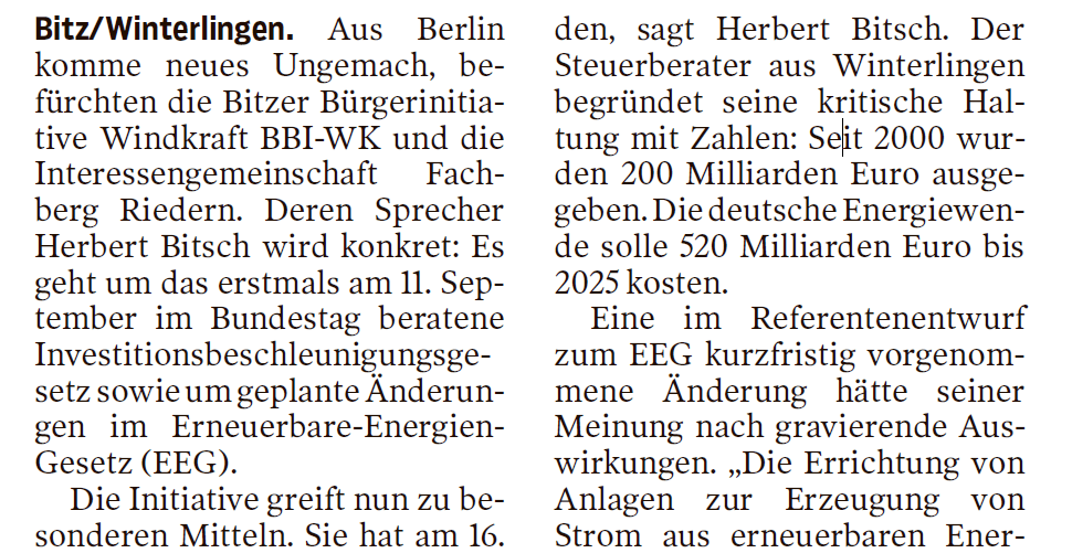 Herbert Bitsch, Sprecher der Bitzer Bürgerinitiative Windkraft BBI-WK und der Interessengemeinschaft Fachberg Riedern IGFR begrüßt diese Entscheidung und betont: „Auch wir haben uns mehrfach mit schriftlichen Eingaben an alle 709 Bundesabgeordneten wegen der geplanten Änderung im EEG gewandt“.