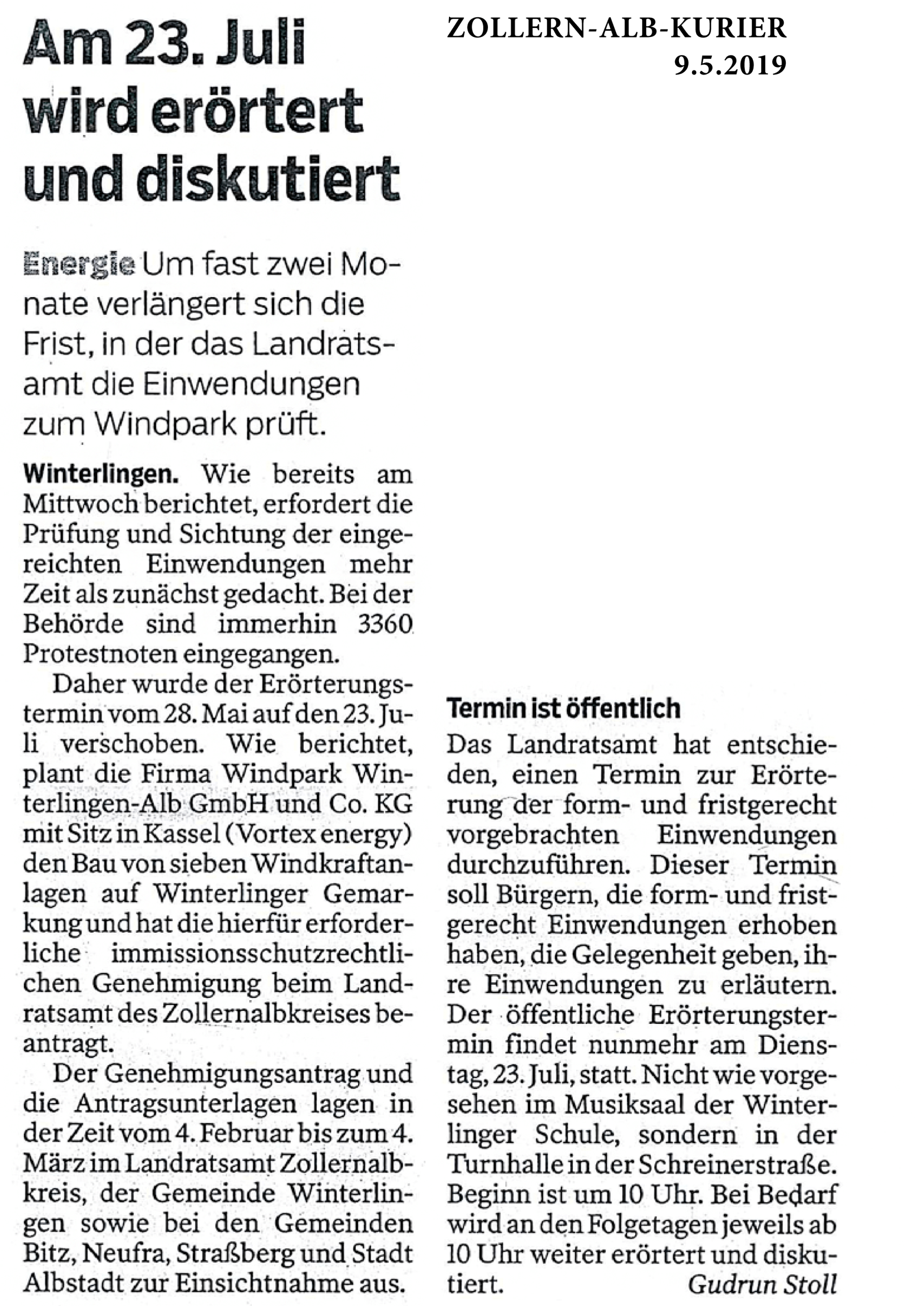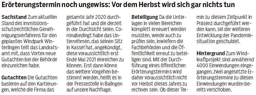 Am 26. September 2020 war im Zollernalbkurier zu lesen: „Bis die ersten Windanlagen in Burladingen errichtet werden, kann es noch dauern. Sofern der Bauantrag die Umweltverträglichkeitsprüfung (UVP) überhaupt besteht. Die EnBW war zunächst davon ausgegangen, dass der Bauantrag in einem einfachen Verfahren durchgeht“.