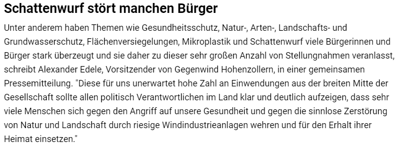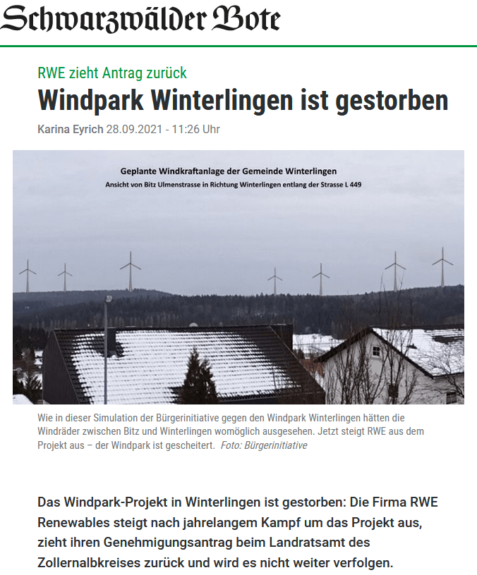 Den Bürgerinitiativen ist es zu verdanken, dass die Naherholung und der Wasser- und Klimaschutz noch gewährleistet sind. Seit Anfang 2016 kämpfen wir gegen das Windräderprojekt im Winterlinger Wald. Ohne unser Engagement stünden bereits 7 riesige, lärmende und gesundheitsgefährdende Windkraftkolosse; jeder Koloss mehr als 235 Meter hoch. Naherholung, Wasser- und Klimaschutz sowie Arten- und Landschaftsschutz und unsere Gesundheit wären buchstäblich unter die Windräder gekommen. Mich schaudert bei diesem Gedanken.