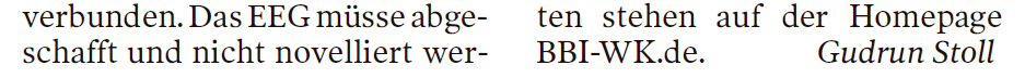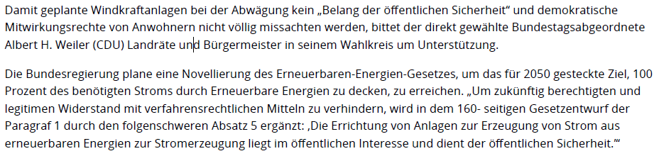 Er rückt mit dieser Aussage die bundesweit unzähligen Bürger, Bürgerinitiativen, Vereine und Naturschutzverbände in den Mittelpunkt, die „mit Erfolg gegen die geplante Gesetzesänderung“ im Erneuerbaren-Energien-Gesetz (EEG) protestiert haben. Zum Hintergrund: In den EEG-Entwurf 2021 sollte der Passus aufgenommen werden: „Die Errichtung von Anlagen zur Erzeugung von Strom aus erneuerbaren Energien liegt im öffentlichen Interesse und dient der öffentlichen Sicherheit.“ Dieser Absatz 5 in Paragraph 1 ist aber entfallen; das verifizierte EEG seit 1. Januar in Kraft.