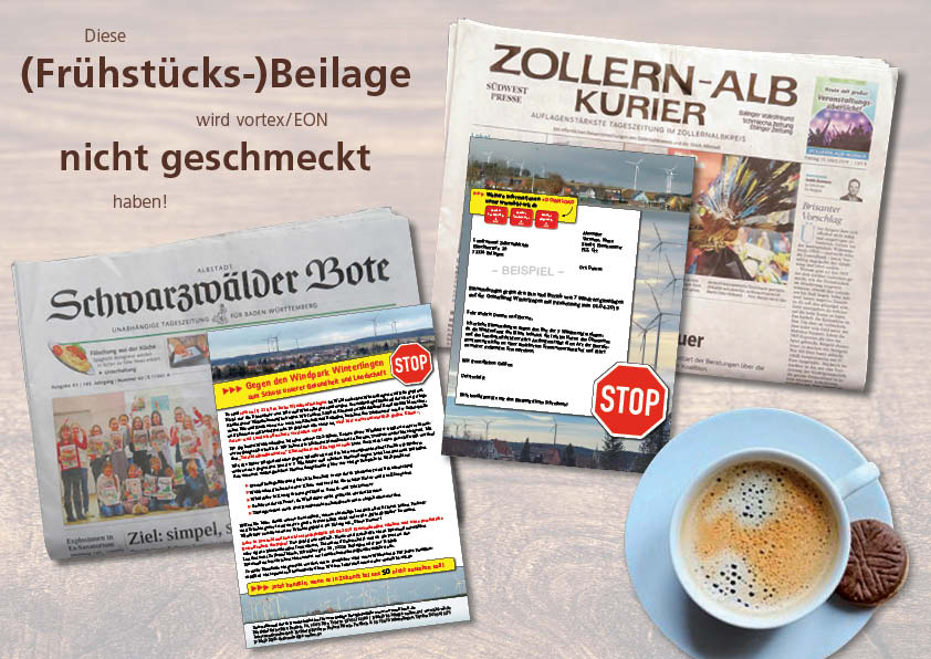 Es werden jeweils zwei Plakate in Bitz und in Freudenweiler aufgestellt. In Winterlingen steht das Plakat auf dem privaten Anwesen von Mitstreiter Jürgen Beck. Die Idee für diese Aktion, so Herbert Bitsch, entspringe einem Gastbeitrag des ehemaligen Hamburger Umweltsenators Prof. Dr. Fritz Vahrenholt zum Thema „Die Energiewende wird an der Windindustrie scheitern“.