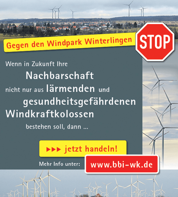 Da Windkraft in Winterlingen nichts zu unserer Stromversorgungssicherheit beitragen wird, wehre ich mich gegen die Gesundheitsgefährdung durch Windkraftanlagen. Auch die geplante Zerstörung von Natur und Landschaft kann ich nicht gutheißen.