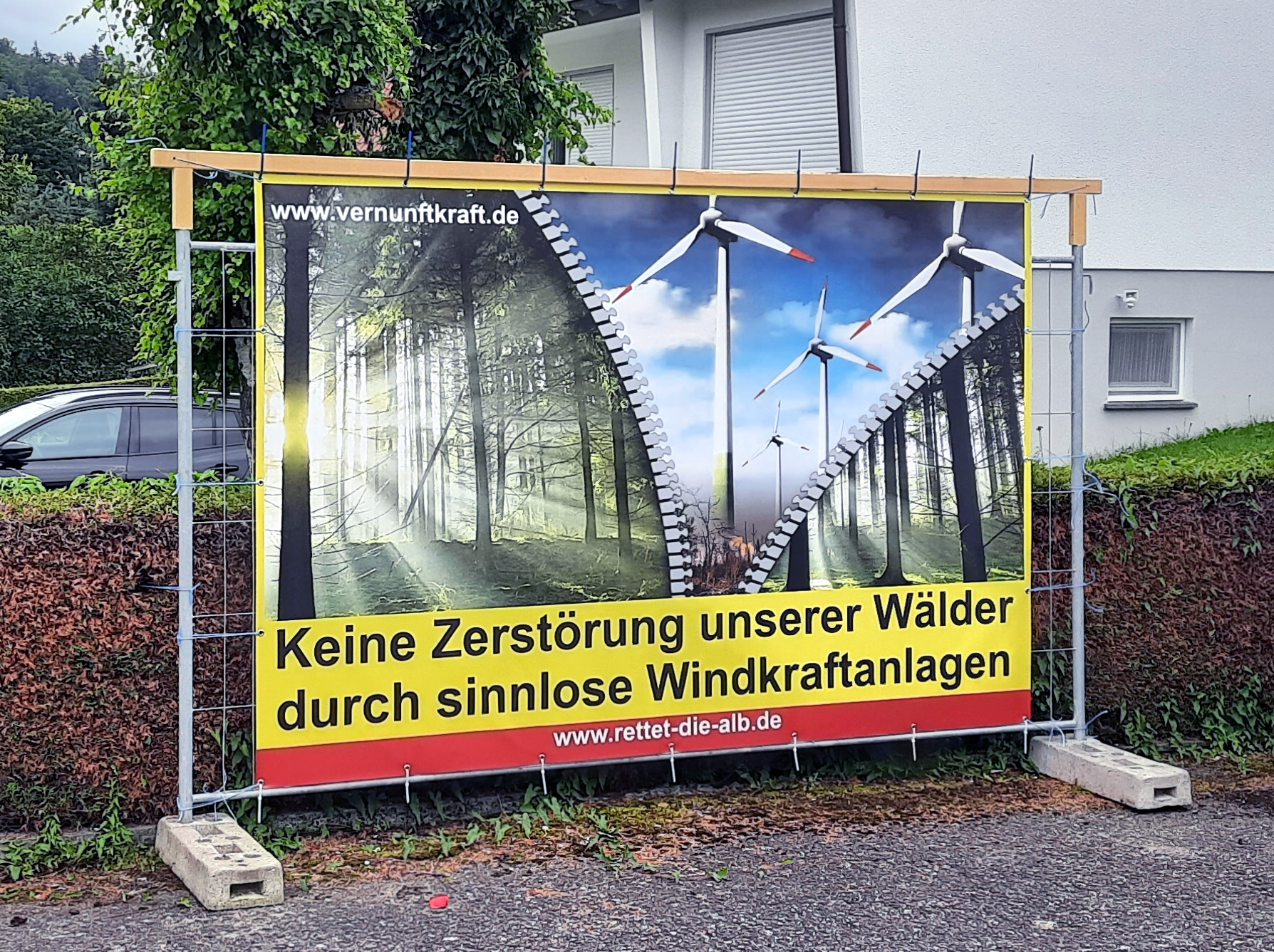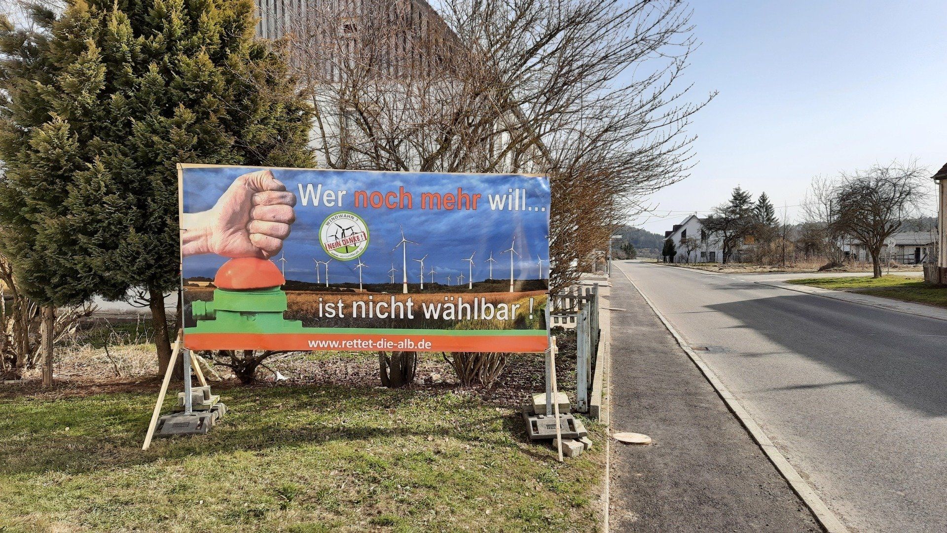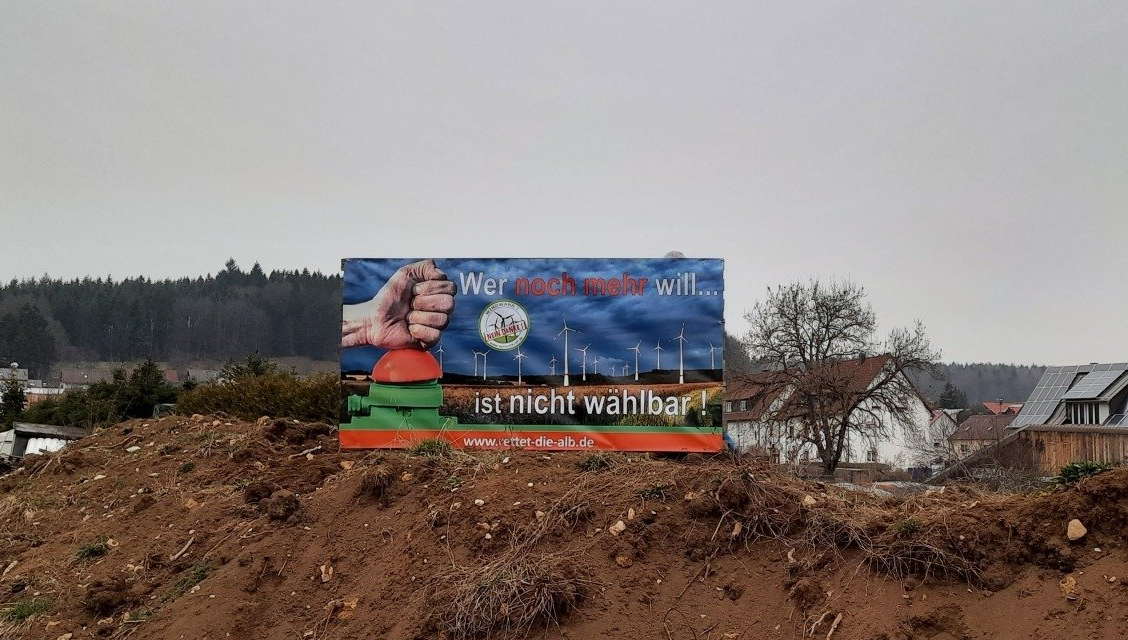 An 22 verschiedenen Standorten in Albgemeinden haben Bürgerinitiativen des windkraftkritischen Bündnisses ‚Rettet die Alb‘ Plakate aufgestellt, die im Vorfeld der Bundestagswahl zum Nachdenken auffordern sollen. Als Mitglied dieses Bündnisses hat auch die BBI-WK ihr Plakat in Bitz gut sichtbar an der Ebinger Straße postiert, um die Bitzer Bürger und den Transitverkehr auf unser Anliegen aufmerksam zu machen.