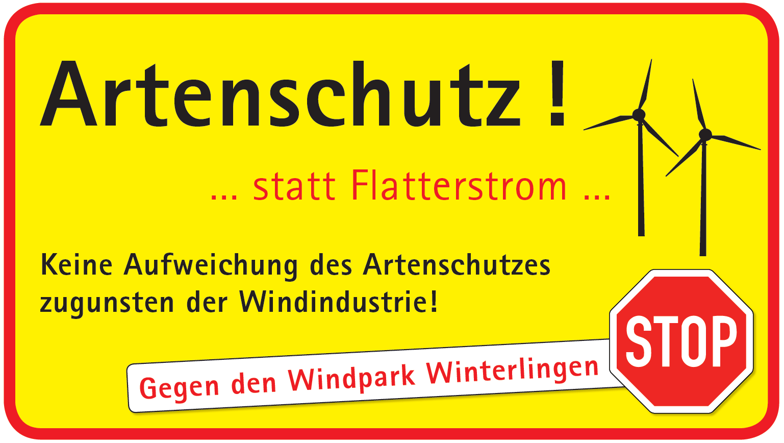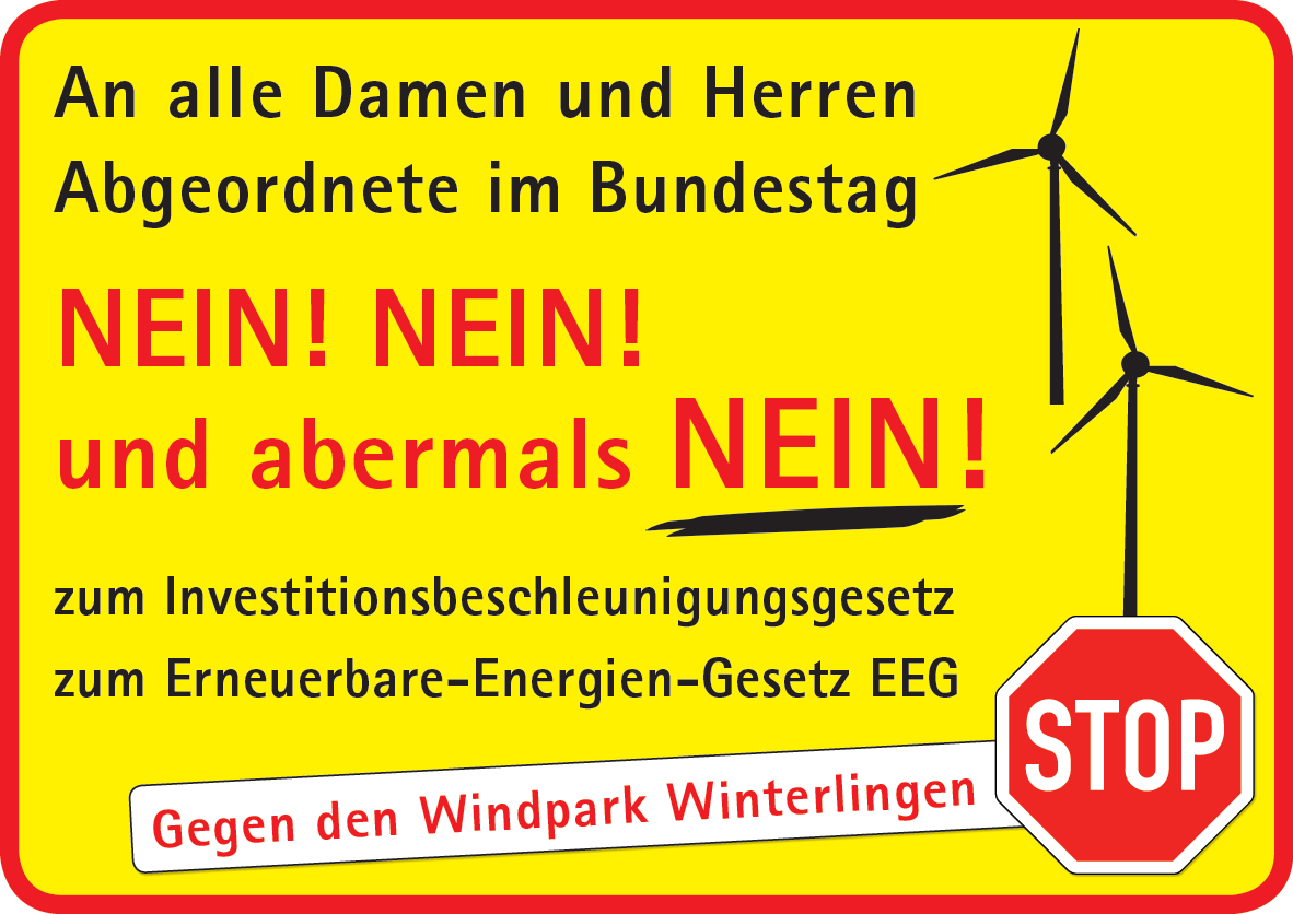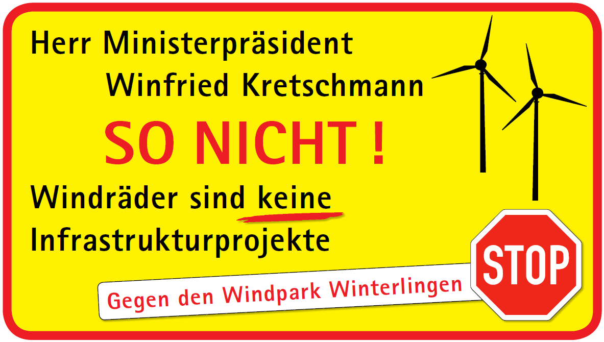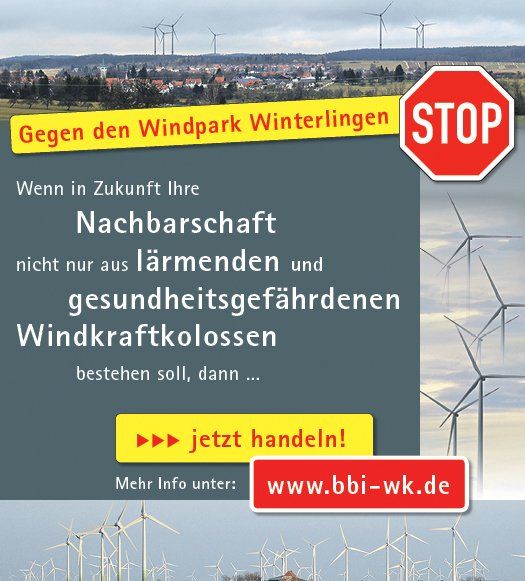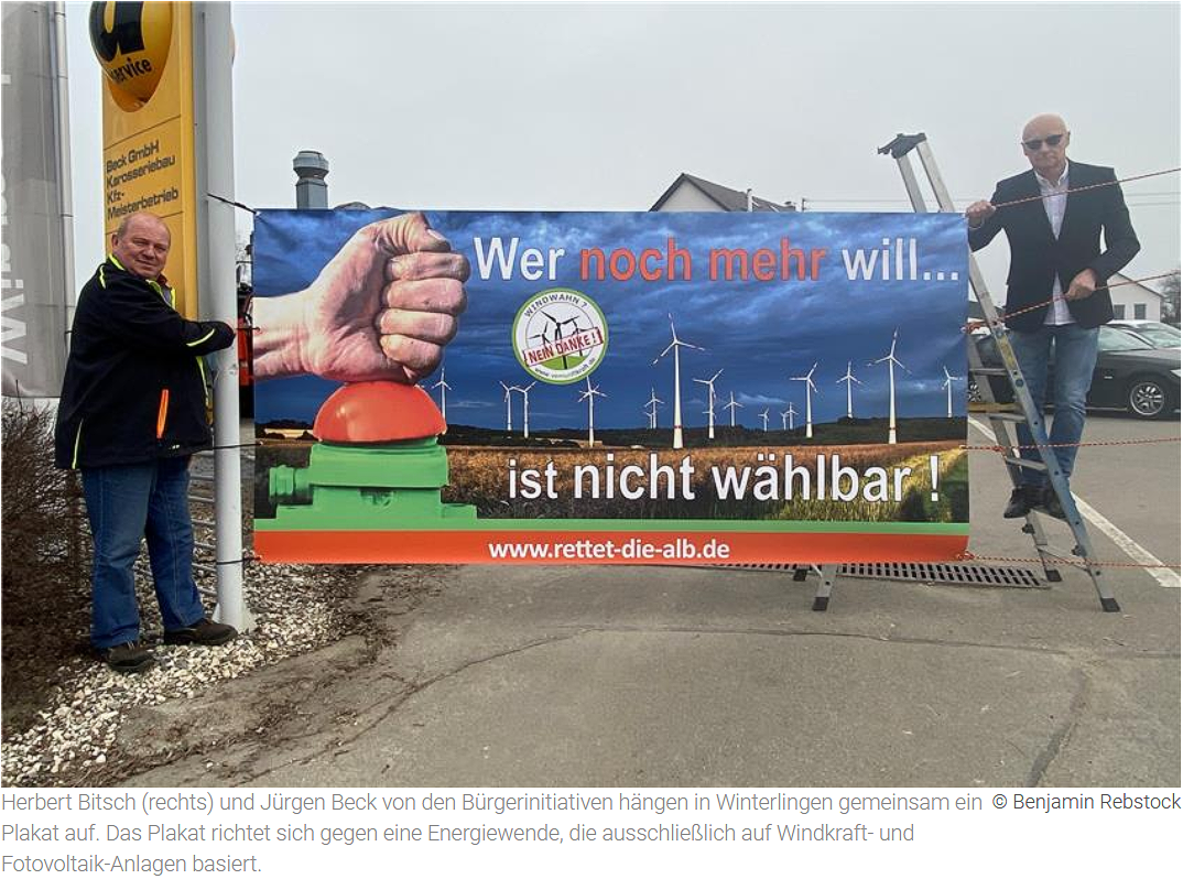 Es werden jeweils zwei Plakate in Bitz und in Freudenweiler aufgestellt. In Winterlingen steht das Plakat auf dem privaten Anwesen von Mitstreiter Jürgen Beck. Die Idee für diese Aktion, so Herbert Bitsch, entspringe einem Gastbeitrag des ehemaligen Hamburger Umweltsenators Prof. Dr. Fritz Vahrenholt zum Thema „Die Energiewende wird an der Windindustrie scheitern“.