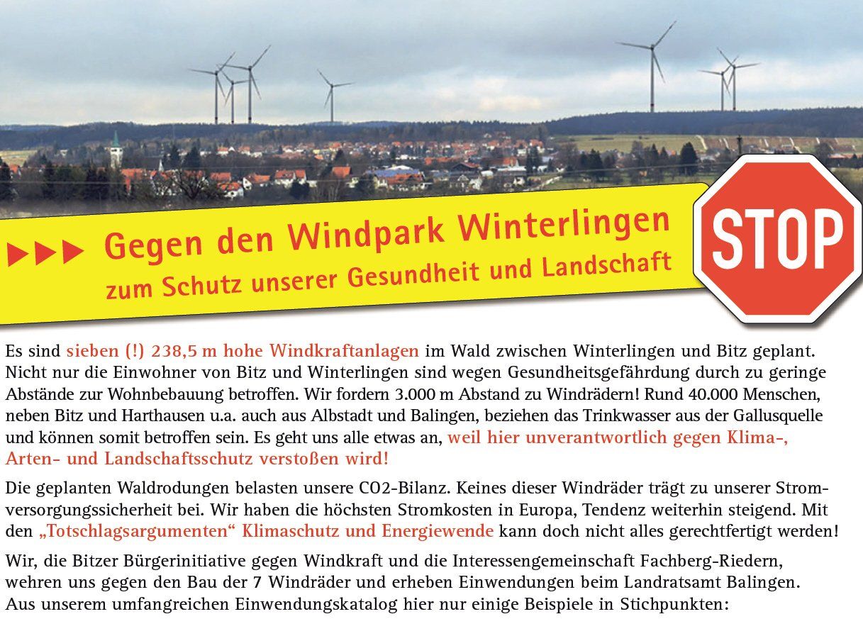 Die Interessengemeinschaft Fachberg Riedern (IGFR) aus Winterlingen und die Bitzer Bürgerinitiative (BBI-WK) befassen sich seit nunmehr sechs Jahren mit der Energiewende. Wir sind gegen den Bau von Windrädern in Wäldern. In unserem Ländle lehnen wir Windräder an unwirtschaftlichen Standorten ab.