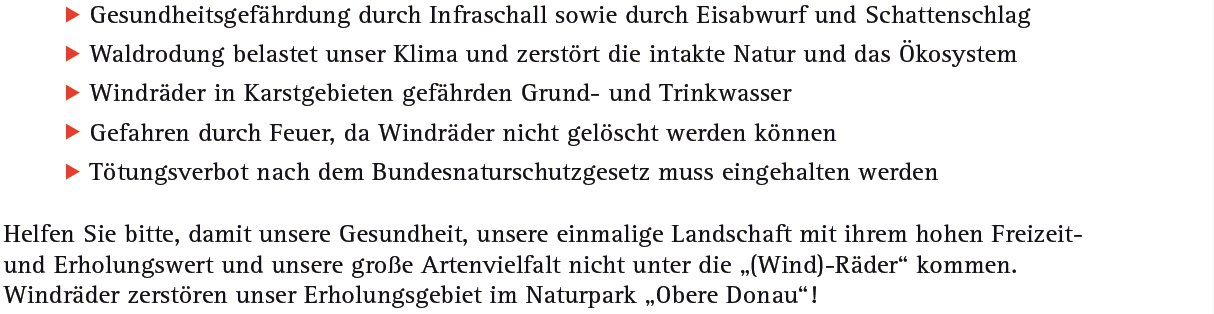 In den Medien wird regelmäßig über den Windkraftausbau berichtet. Auch wir sind für Klimaschutz. Aber durch noch mehr Windräder und die damit verbundene Zerstörung der Natur mit allen Folgeschäden wird der Klimaschutz nicht erreicht werden können.