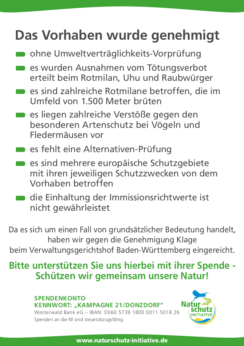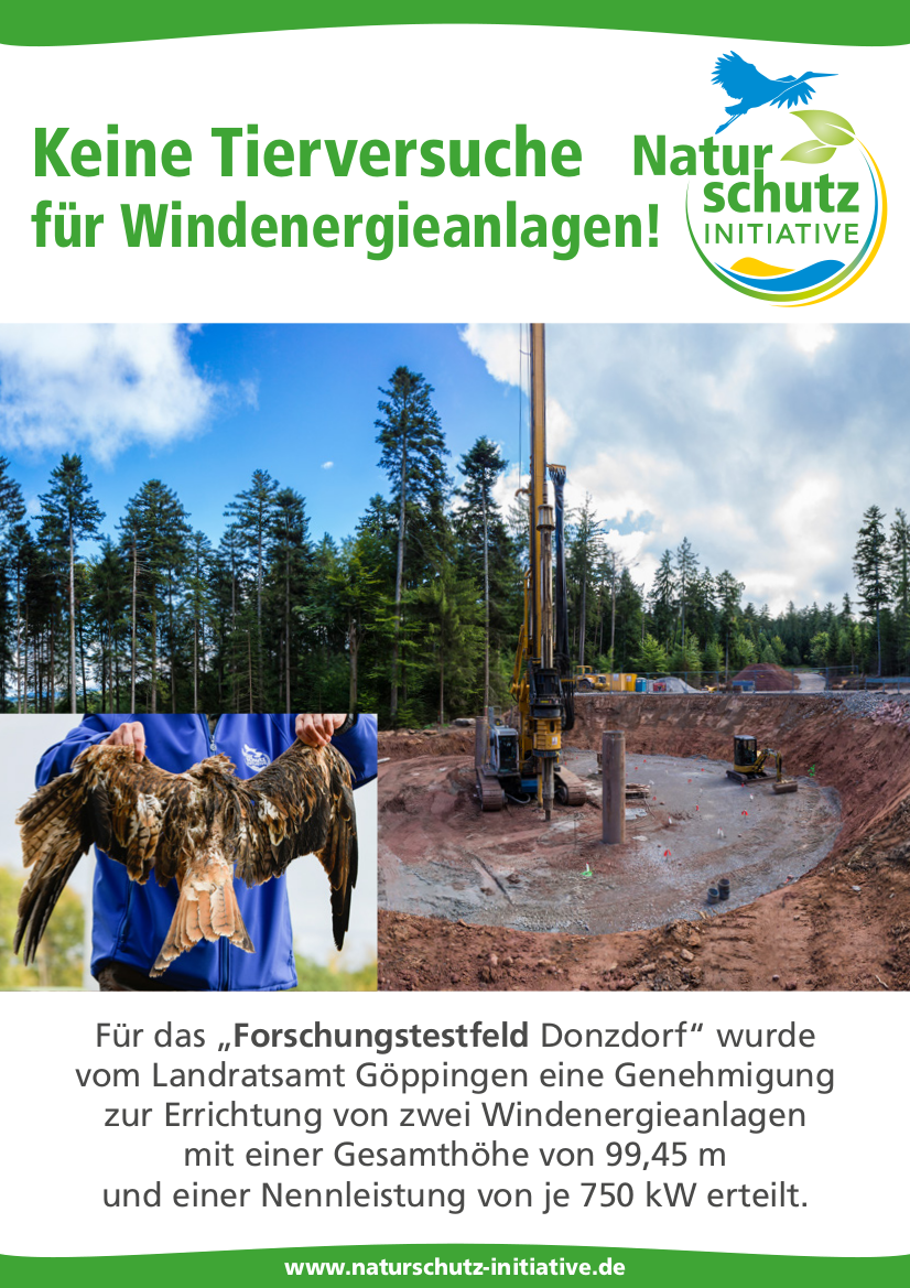 Heute wenden wir uns mit einem Spendenaufruf an unsere Mitstreiter, Freunde, Unterstützer und Windkraftkritiker. Wir begrüßen die Klage der Naturschutzinitiative (NI) gegen ein Windräderprojekt in Donzdorf, da das Klageverfahren auch Auswirkungen auf das geplante Windräderprojekt zwischen Winterlingen und Bitz haben kann. Konkret geht es um Ausnahmen vom Tötungsverbot für geschützte Tierarten.
