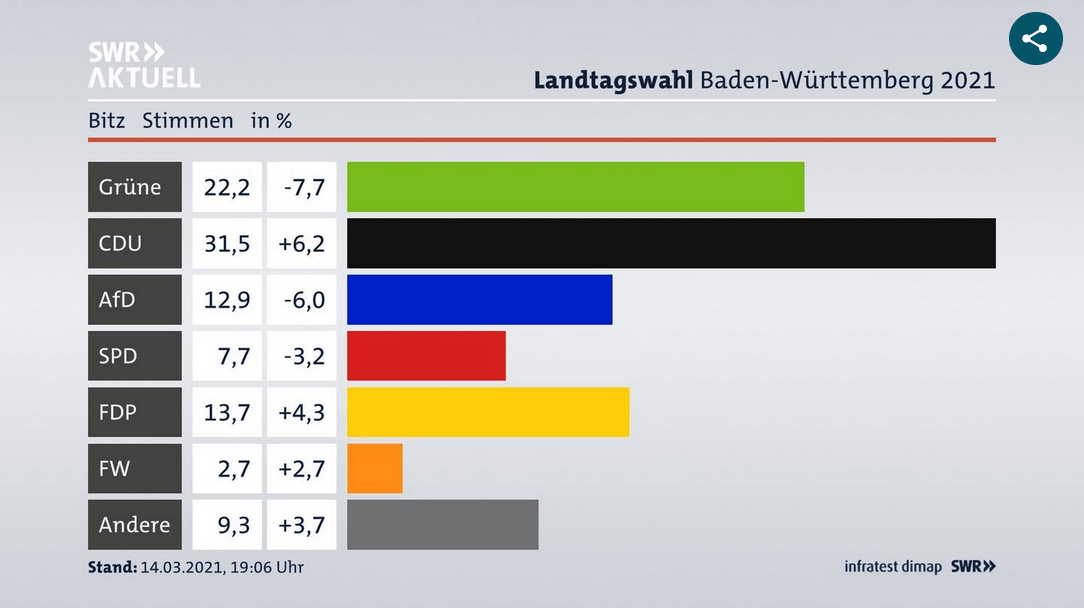 Die FDP hat auch wegen ihrer Haltung zur Windkraft in Winterlingen um 2,4 % und in Bitz um 4,3 % zugelegt. Ich sehe in diesem Ergebnis auch eine Verpflichtung, in den möglicherweise anstehenden Koalitionsverhandlungen mit den GRÜNEN nicht vom Kurs abzuweichen. Sie wissen ja. Nach der Wahl ist vor der Wahl (Bundestag)!