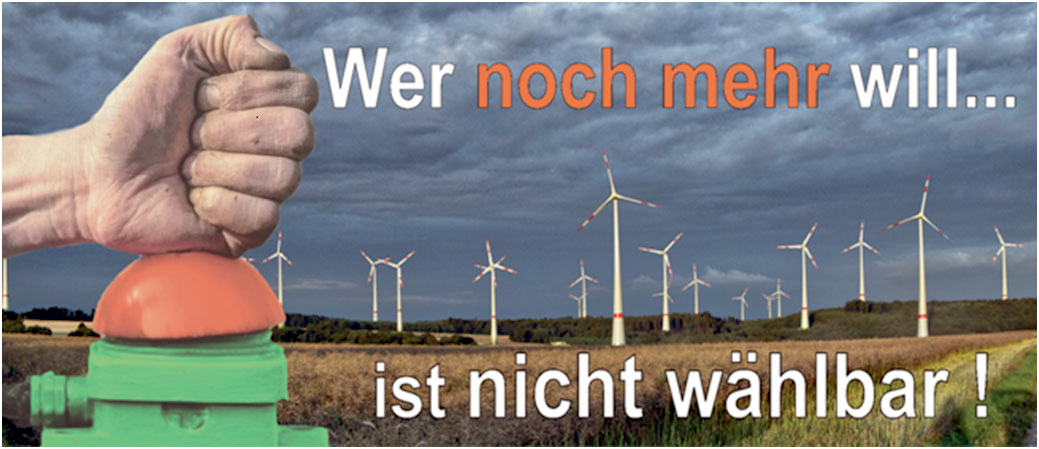 Und wir Menschen? Wir kommen „sprichwörtlich“ unter die Windräder, weil die GRÜNEN im Wahlprogramm keine Mindestabstände von Windkraftanlagen zur Wohnbebauung und damit auch keinen Schutz der Menschen vorgesehen haben.