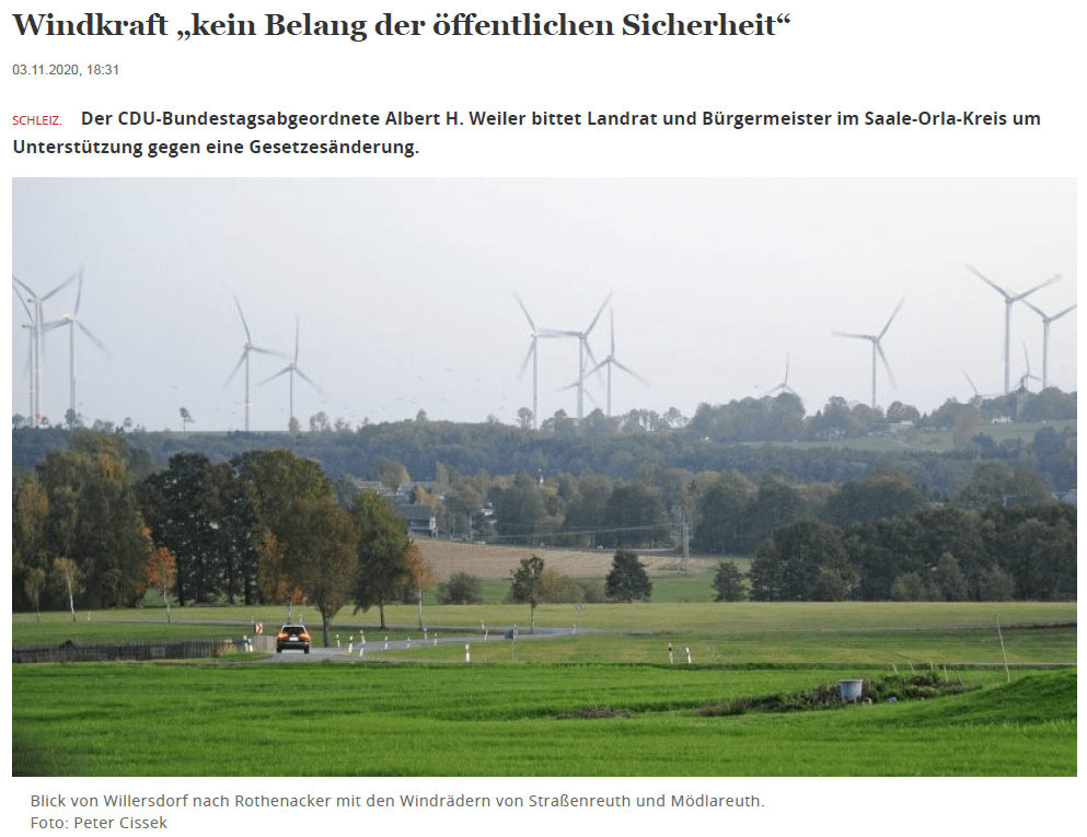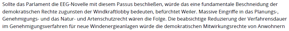 Er rückt mit dieser Aussage die bundesweit unzähligen Bürger, Bürgerinitiativen, Vereine und Naturschutzverbände in den Mittelpunkt, die „mit Erfolg gegen die geplante Gesetzesänderung“ im Erneuerbaren-Energien-Gesetz (EEG) protestiert haben. Zum Hintergrund: In den EEG-Entwurf 2021 sollte der Passus aufgenommen werden: „Die Errichtung von Anlagen zur Erzeugung von Strom aus erneuerbaren Energien liegt im öffentlichen Interesse und dient der öffentlichen Sicherheit.“ Dieser Absatz 5 in Paragraph 1 ist aber entfallen; das verifizierte EEG seit 1. Januar in Kraft.